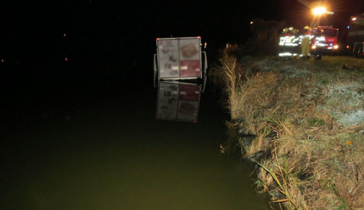Na noční cestu mladý řidič rozhodně nebude vzpomínat v dobrém. Při havárii se lehce zranil a nákladní vůz Iveco Daily skončil ponořený ve vodě u samého břehu až do poloviny návěsu a z rybníku jej museli za použití těžké techniky vyprostit hasiči.