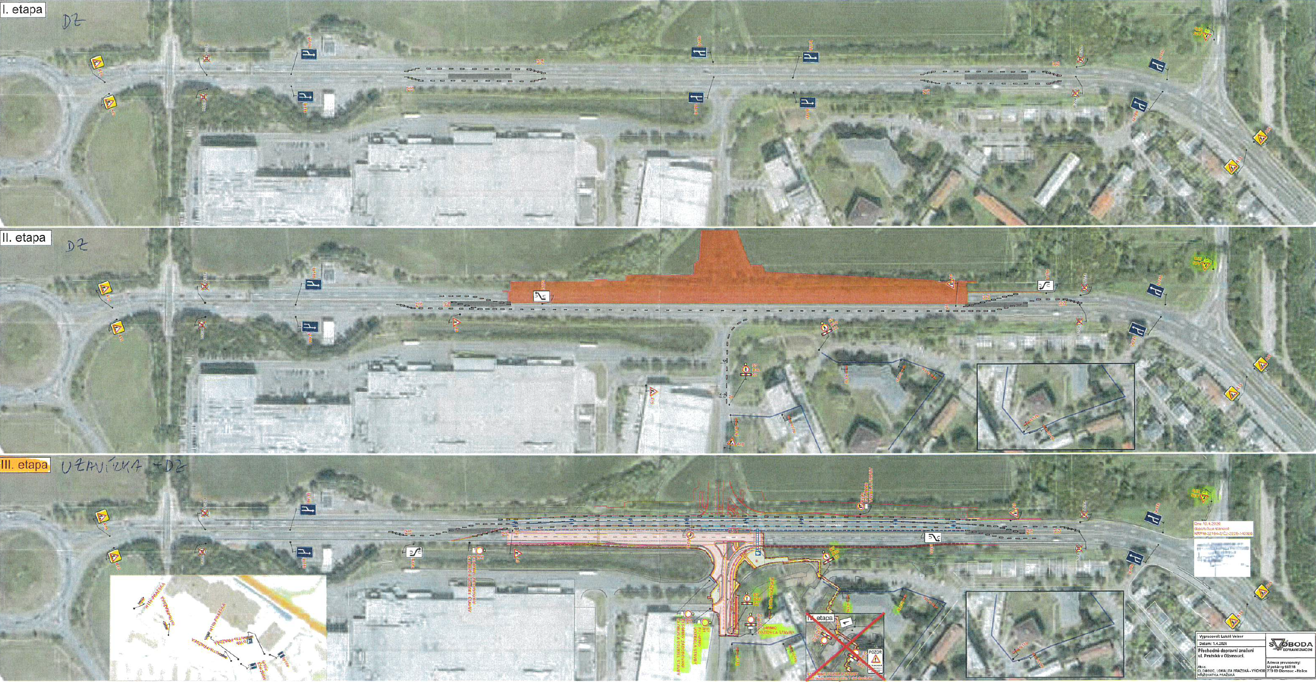 Podle dokumentace a informací na webu města budou nejprve týden neprůjezdné části levých pruhů v obou směrech, aby bylo možné odstranit svodidla a upravit středový pás pro přejíždění na druhou stranu čtyřpruhu. Následovat má od 18. května do srpna uzavření pravé poloviny Pražské ulice ve směru od Olomouce ke Globusu. Provoz bude vedený v režimu 1+1, tedy jeden pruh pro každý směr. Poté by se mělo ve 3. etapě od srpna do listopadu jezdit po nově upravené části křižovatky a přestavovat se bude oblast budoucího napojení nové bytové zóny.