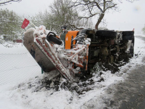 Během včerejšího krušného počasí vyjely na mnoha místech republiky sypací vozy. Některé však měly problémy, aby vůbec dojely v pořádku do cílové stanice. Řidič sypače v Raškově byl jedním z nich. Se svým vozem skončil v příkopu.