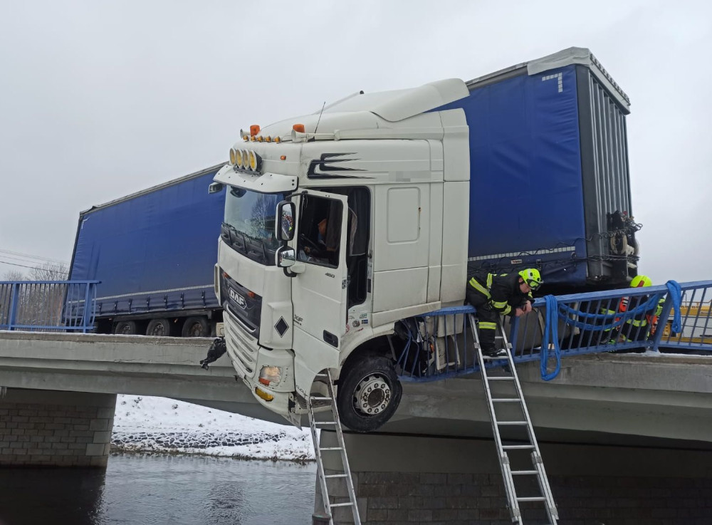 FOTOGALERIE: Na Jesenicku havaroval kamion, málem spadl z mostu