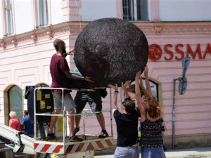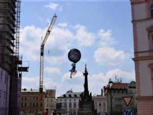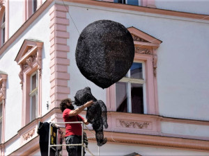 FOTO: Na Horním náměstí visí dítě přisáté k prsu. Socha je součástí festivalu Sculpture Line