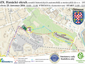Po vyhlášení nejelegantnějšího automobilu a motocyklu budou od 11.00 hodin historická vozidla postupně startovat na prostranství za pavilonem A v areálu Výstaviště Flora Olomouc do dopolední etapy. Každé vozidlo i s posádkou bude divákům představeno a start více než 130 historických automobilů a motocyklů tak potrvá zřejmě až do 13.00 hodin. První etapa zavede posádky na pohádkový hrad Bouzov, kde budou zhruba mezi 13.30 až14.30 hodin všechna vozidla v parku před hradem opět vystavena pro diváky. Poté bude před vstupní bránou do hradu odstartována druhá etapa, která historické automobily a motocykly přivede zpět do Olomouce. Trasa Hanáckého okruhu měří 103 km a vede přes dvacítku obcí v samém srdci Hané. V některých z nich čekají posádky zábavné či vědomostí průjezdní kontroly (Hněvotín, Senice na Hané, Loštice, Střeň a Štěpánov). Vítězem se však stane každý, kdo se strojem starším více než 80 let přijede bez závady do cíle.
