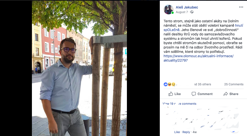 Jakubec zdůraznil, že zcela jiný rozměr dostala celá věc až v diskuzi pod fotkou, který ten den umístil na sociální sítě. Tam již adresně jmenoval, že za zaléváním stromů na Dolním náměstí stojí hnuti spOLečně. „Tento strom, stejně jako ostatní akáty na Dolním náměstí, se může stát obětí volební kampaně hnutí spOLečně. Jeho členové ve své „dobročinnosti“ nalili desítky litrů vody do samozavlažovacího systému a stromům tak hrozí uhnití kořenů. Pokud byste chtěli stromům skutečně pomoci, obraťte se prosím na mě či na odbor životního prostředí. Rádi vám sdělíme, které stromy to potřebují," napsal tehdy k fotce.