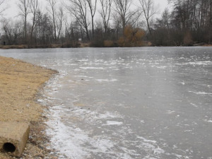 Když jsme vrtali včera, měl led asi deset centimetrů, říká provozovatel Poděbrad u Olomouce Jiří Holub. Společně jsme dnes udělali další díru do ledu. Led byl dnes v jednu odpoledne silný třináct centimetrů.