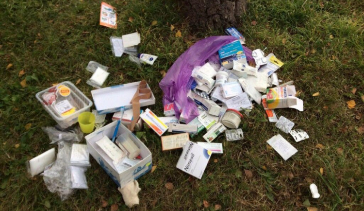 V trávě před prodejnou potravin v ulici Přichystalova byly včera ráno nalezeny desítky krabiček s léky a zdravotnickým materiálem.