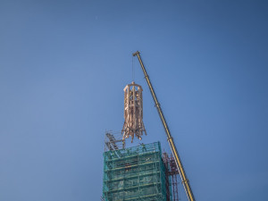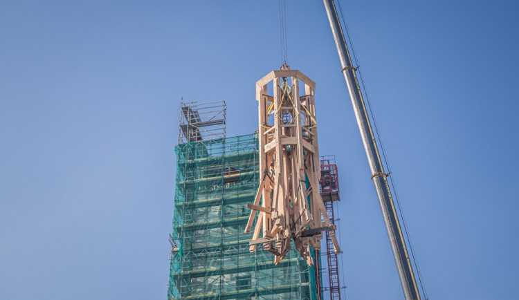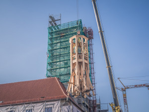 Nejvyšší část špice věže, která je nyní v depozitáři, přijde na řadu až jako poslední v první polovině příštího roku. Její konstrukce se bude opět kompletovat na Horním náměstí a po dokončení ji jeřáb vyzvedne nahoru.
