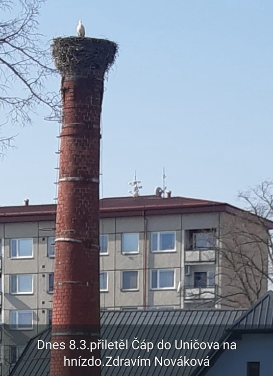 Prvního čápa v Olomouckém kraji dnes ráno lidé zaznamenali na komíně polikliniky v Uničově na Olomoucku. "Jeden dospělý čáp stojí na hnízdě," hlásil kolem sedmé hodiny ráno jeden z pozorovatelů.