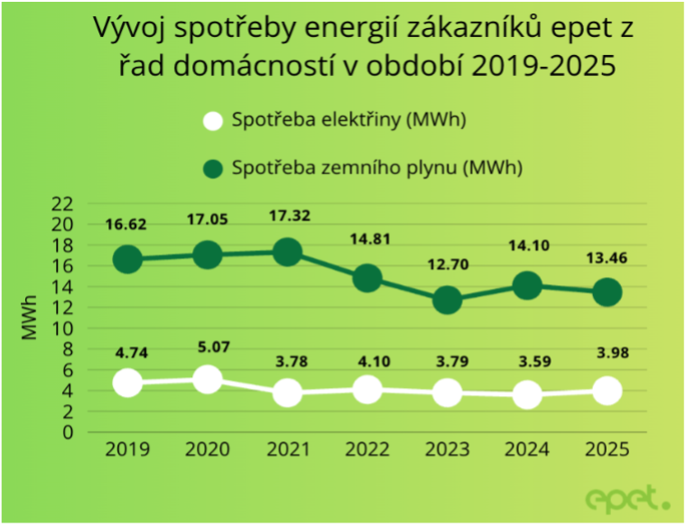 Potvrzují to i data dodavatele energií, společnosti epet, za roky 2019 až 2025. U zemního plynu byla průměrná spotřeba domácností nejvyšší v roce 2021, kdy dosáhla 17,32 MWh. V roce 2025 už činila 13,46 MWh, tedy zhruba o 22 procent méně. Podobný vývoj je vidět i u elektřiny. Zatímco v roce 2020 dosahovala průměrná spotřeba 5,07 MWh, loni to bylo 3,98 MWh, což představuje pokles asi o 21 procent.