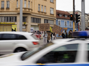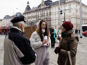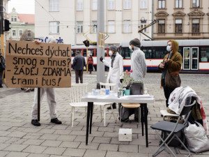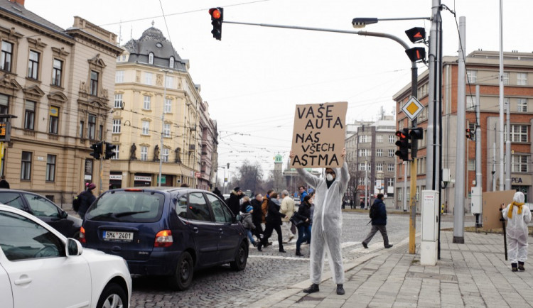 Několik aktivistů v pondělí v centru Olomouce s rouškami na obličejích a transparenty v rukou uspořádalo happening, jímž chtěli kolemjdoucí i řidiče projíždějících automobilů upozornit na časté smogové situace ve městě.